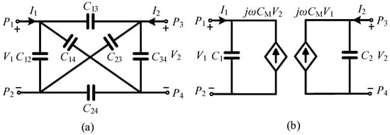 where εr represents the relative dielectric constant, S is the coupling area of coupler plates, and k represents the electrostatic constant. Therefore, Figure 3a shows the full-capacitor model of the four-plate capacitive structure and the equivalent induced current source model is shown in Figure 3b. The relationships of port voltage V1, V2, and current I1, I2 are expressed as follows.