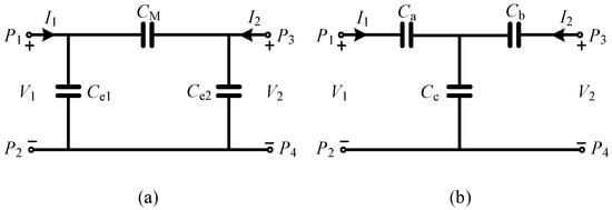 According to Equation (2), the simplified π-type and T-type models of the four-plate structure are presented in Figure 4, where the capacitance value satisfied the expressions shown in Equations (3) and (4):