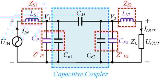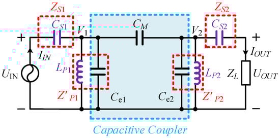 When UIN is designed to be constant, the input source is considered a constant voltage source. The equivalent circuit is shown in Figure 6 by substituting the π-type model of the coupler structure into the SP compensation topology CPT system. Z′P1 and Z′P2 are composed of the self−capacitance (C1 − CM) and ZP1 as well as (C2 − CM) and ZP2, respectively, which satisfy the expressions as follows.