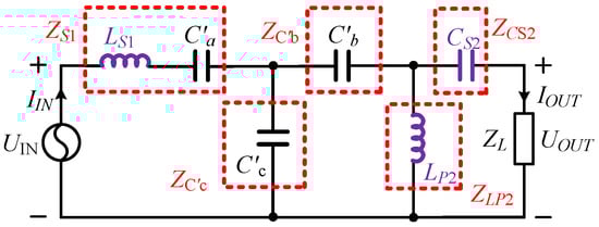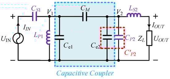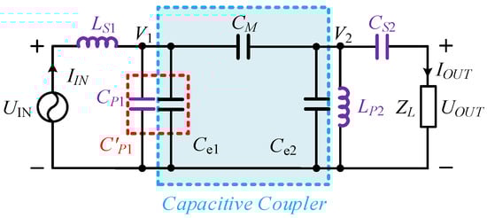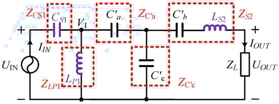 The LC−CL compensation topology with the π-type equivalent circuit of the capacitive coupler structure is shown in Figure 11. LS1 and CS2 represent the series compensation inductor and capacitor, respectively. CP1 and LP2 represent the paralleled compensation capacitor and inductor, respectively. Similar to the analysis of CL−LC topology, the LC−CL compensation topology with a T-type coupler model is shown in Figure 12, where C′a, C′b, and C′c is given by