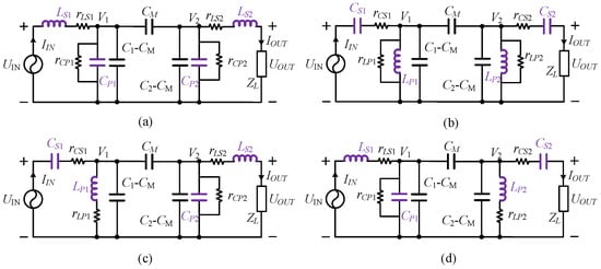 SP-based CPT topology considering the parasitic resistance. (a) Double-sided LC compensation, (b) double-sided CL compensation, (c) CL−LC compensation, (d) LC−CL compensation.