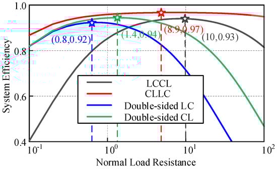 Figure 14 illustrates the system efficiency curves against the variations of load resistance for four SP compensation topologies. The output voltages of the four topologies are designed to be the same. The voltage gains of CLLC and LCCL are 0.2 and 5, respectively. It can be seen that the system efficiency of CLLC topology is the highest among the load variations, which is due to the CLLC topology in CV mode equivalent to the buck converter, leading to the smallest loop current under the same power level. Each compensation topology has an optimum load resistance to achieve the highest system efficiency. The optimum load resistance can be adjusted according to the application requirements.
