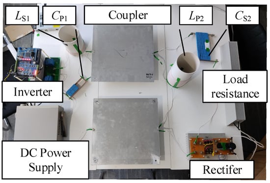 To verify the proposed theory, an experimental prototype of the CPT system with LCCL compensation topology is built up, as shown in Figure 15. The coupler structure consists of four 300 mm × 300 mm aluminum plates. The transfer distance is set to 5 mm. The switching devices of the full−bridge inverter adopted C2M0160120D MOSFETS, and the MSC020SDA120B−ND diodes were used in the full−bridge rectifier. In order to eliminate the undesirable magnetic loss of ferrite in the traditional inductor, the compensation inductors in the experiment adopted the air−core inductor constructed by PVC tubes wounding with Litz wire. To reduce the size of inductors, the switching frequency of MOSFETS was set to 1 MHz. The system parameters are listed in Table 5.