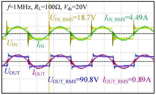 When the voltage gain of the LCCL compensation CPT system is designed to 5, the experimental AC waveforms of UIN, IIN, UOUT, and IOUT are shown in Figure 16. The value of UIN, IIN, UOUT, and IOUT is 18.7 V, 4.49 A, 90.8 V, and 0.89 A, respectively. The phase difference between the input voltage and the input current is close to zero degrees, and it can be concluded that the ZPA operation of LCCL topology to achieve CV output is achieved without an extra compensation circuit. As the parasitic resistances of compensation components exist, the measured voltage gain with 100 Ω load resistance is 4.52.