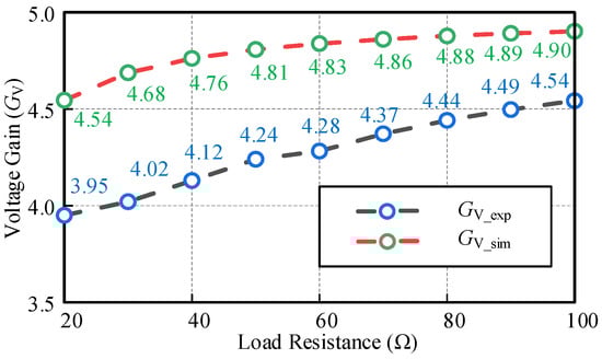 To verify the constant output voltage characteristics, the output voltage gains are measured with load resistance changing from 100 Ω to 20 Ω. The measured results and simulated results are illustrated in Figure 17. The simulated results are conducted in MATLAB/SIMULINK models. When the load resistance increases to 5 times itself, the voltage gain changes from 4.54 to 4.90 in simulation models. While in practice, due to the impact of the parasitic resistance of passive components, the voltage gain increased from 3.95 (79 V) to 4.54 (90.8 V), spaces missing, and the rate of voltage change reached 12.9%. The voltage drop can be reduced in practical applications by adopting compensation elements with more minor resistance and more accurate passive components.