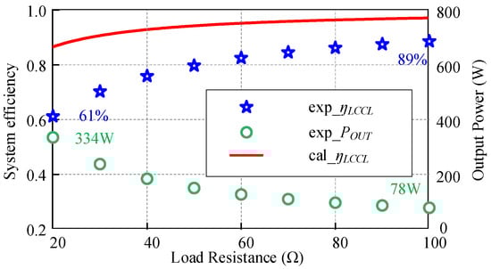 Figure 18 shows the measured system efficiency and output power with changing load resistance. As the output voltage is independent of load resistance, the output power decreased from 334 W to 78 W with load resistance changed from 20 Ω to 100 Ω. Since the losses of the inverter, rectifier, and capacitive coupler are not considered in the calculation of system theoretical efficiency, the system experimental efficiency is obviously lower than the system theoretical efficiency. The system efficiency increased with the increasing load resistance, which is consistent with theoretical analysis. Therefore, the double-sided LC compensation CPT system preferred the heavy load situation. The maximum system efficiency when load resistance changes from 20 Ω to 100 Ω can reach 89% and the system efficiency can be lifted further by using compensation elements with high−quality factors.