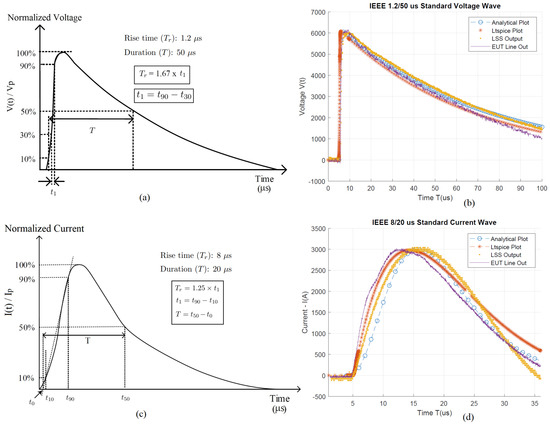 The 1.2/50 s voltage waveform and 8/20 s combined current waveform: (a) nominal waveform of the 1.2/50 s voltage wave as per IEEE C62.41; (b) comparison plots for a 6 kV 1.2/50 s voltage wave: analytical plot, LTSpice plot, LSS output, and EUT line out; (c) nominal waveform of the 8/20 s current wave as per IEEE C62.41; (d) comparison plots for a 3 kA 8/20 s current wave: analytical plot, Ltspice plot, LSS output, and EUT line out.