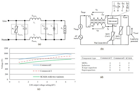 Comparison of the SCASA topology with other commercial SPDs: (a) traditional differential-mode surge protector; (b) generalized SCASA circuit; (c) load–voltage comparison of SCASA and other commercial protectors; (d) component count comparison of SCASA and other commercial surge protectors.