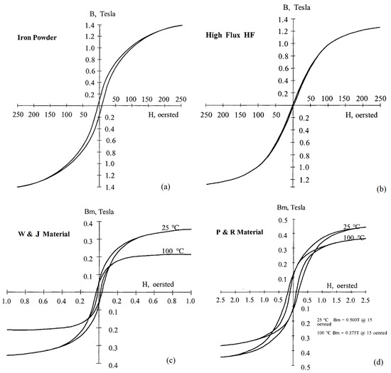 Hysteresis characteristics comparison of powdered-iron and ferrite materials used to design SCASA prototypes: (a) Kool u (powdered iron) hysteresis loop; (b) High-Flux (powdered iron) hysteresis loop; (c) hysteresis behavior of W and J ferrites; (d) hysteresis behavior of P and R ferrites [20].