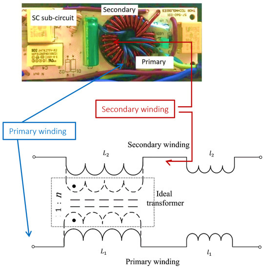 The two coupled-inductor coils of the SCASA transformer (Figure 9) possess magnetizing inductances (, ) and leakage inductances (, ) associated with the primary and secondary sides of the core.