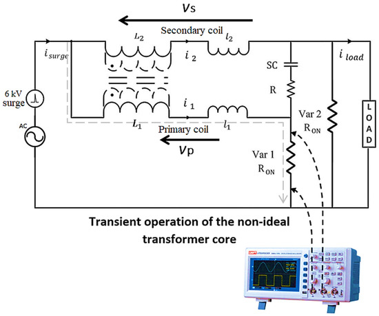 Under high-magnitude voltage (1.2/50 s, 6 kV) and current (8/20 s, 3 kA) transients, both SCASA MOVs Var 1 and Var 2 exceeded their breakdown limits; thus, they entered into conduction modes [26], as characterized by the appropriate “ON resistances” () illustrated in Figure 10. The varistor model [27] of V20E275 (Littlefuse, UltraMOV Series) used in the SCASA design predicted that the ON resistances (Var1 and Var2) were between 0.2–1 under transient currents [27,28]. Notably, for transient frequencies, the inductive impedances of two SCASA coupled coils dominated; hence, more the inductive secondary coil () received only 8% of the surge current, while 92% of the transient current flowed into Var1 through the primary () coil [29]. More details about the coupled-inductor current division for both transient and 50 Hz RMS conditions were given in our previous publication. In this research, we focus on investigating the voltages induced in primary and secondary coils, as predicted by the following equations. This would further help us understand more about the transformer action shown by the SCASA magnetic core.