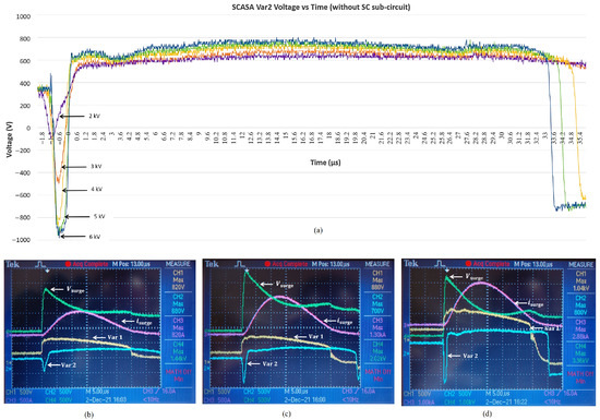 Fluctuation of the Var2 voltage under different surge settings: (a) variations in (negative voltage peak) in the Var2 voltage for 2–6 kV; (b) oscilloscope waveform for a 2 kV LSS surge output; (c) oscilloscope waveform for a 3 kV LSS surge output; (d) oscilloscope waveform for a 6 kV LSS surge output.