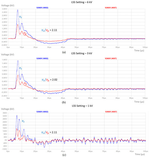 As per the theoretical predictions described above (Equations (14) and (15)), the secondary:primary voltage ratio was : 4.13, and it was consistent with the SCASA turn ratio, = 4.6, with a ∼10% deviation. However, this ideal voltage ratio (as in the case of an ideal transformer) deviated considerably according to the experimental and simulated results. To study this non-ideal behavior of the SCASA coupled inductor, we conducted LTSpice simulations under different LSS settings from 1 to 6 kV (Figure 12). In Figure 12a, induced voltages and were found as ∼3.56 kV and ∼1.7 kV, respectively, for the 6 kV surge setting. Therefore, : = 2.1, as verified by the simulated waveform; this significant deviation (compared to the theoretical results) suggests that the SCASA core did not behave as an ideal transformer.