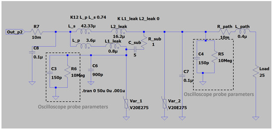 In addition to the permeance model of the SCASA magnetic core described above, we conducted a simulation analysis based on an LTSpice circuit model. The model consisted of an LSS-6230 internal generation unit and the details of the SCASA equivalent circuit (non-ideal transformer, MOVs, and SC sub-circuit). Considering the accuracy of our simulation, the X- and Y-type EMI filtering capacitors (C6, C7, and C8), oscilloscope probe parameters, and path impedance (due to parasitic inductances/capacitances) characteristics of connection probes were added to the LTSpice model (see Figure 13 and Figure 14). The LSS wave generation circuit shown in Figure 13 generated standard combinational surge waveforms (1.2/50 s voltage wave and 8/20 s current wave), which were then injected into the SCASA circuit. More details about these standard wave shapes were described in Section 1.3.