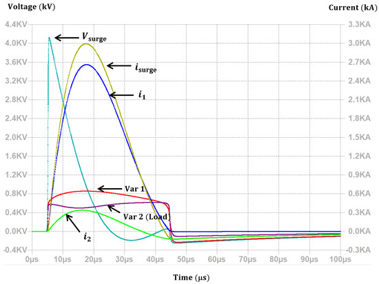 The combination current waveform is produced when the 1.2/50 s voltage wave is short-circuited [7], and the resulting short-circuit current (Figure 3c,d) has the following characteristics:
