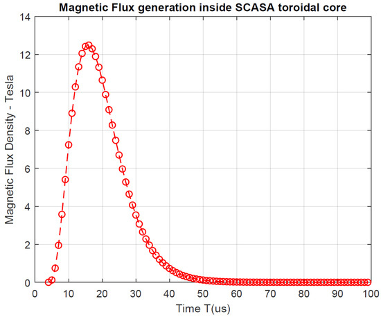 In addition, we could identify that the low saturation flux capacity of the Kool u (10,500 gauss) core was another important factor that affected the ideal transformer action. Due to the high-magnitude surge current (3 kA) propagating through the SCASA windings, the core was saturated, thus lowering the induced voltage ratio :. In Section 3.5, we determine the SCASA toroidal flux for a 3 kA transient and discuss the limitations of the Kool u core while introducing several other magnetic materials that are suited for high-performance prototypes.