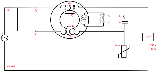 The empirical validation of the surge absorption potential of supercapacitors resulted in the development of a supercapacitor-based transient suppressor named SCASA. The original circuit design comprised an SC sub-circuit, as shown in Figure 5b. The low DC rating (2–4 V) of SCs prevents their direct application across 230 V AC mains (or SCs cannot be placed in parallel with an NLD) [14]. Thus, in designing the SCASA topology, coupled inductor windings were utilized with a powdered iron magnetic core (Kool u 0077071A7- Magnetics Inc.), which had a relative permeability of = 60 [15]. In the SCASA design depicted in Figure 5b, a configuration of two coupled windings was selected in such way that the primary coil ( = 6 turns) created a reduced-impedance path for transient propagation in comparison with the more inductive secondary, which consisted of 28 turns (). Overall, magnetic induction of the two SCASA coils minimized the passage of transient energy to the load in terms of surge flux storage within the toroid. The topology also facilitated the continuous flow of 230 V, 50 Hz mains without blocking the AC line frequency.