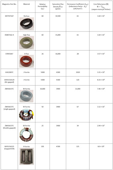 - Magnetics Inc. ‘2021 Magnetics Powder Core Catalogue’, Mag-inc.com. 2021. Available online: https://www.maginc.com/Design/Technical-Documents/Powder-Core-Documents (accessed on 26 January 2022).