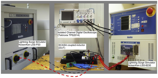 In Section 1.3, we presented details about the standard combinational waveforms (1.2/50 s open-circuit voltage wave and 8/20 s current wave) used for SPD testing. In a high-voltage laboratory encased similarly to a Faraday cage, where electromagnetic radiation was shielded, Lightning Surge Simulators (LSS-6230 and LSS-F03) were used to generate combined transients of a magnitude of 6 kV/3 kA. The device-under-test (DUT) SCASA coupled inductor was connected to 230 V mains via LSS-6230, as shown in Figure 20.