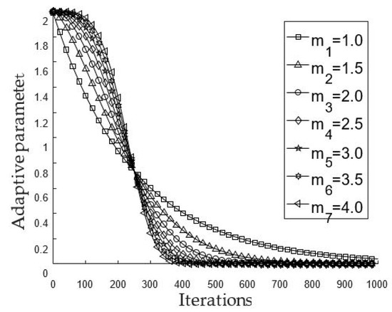 The selection of the m value affects the balance relationship between global and local searches by the sparrow explorer. As can be seen from Figure 2, each curve converges quickly in the early stage and slowly in the late stage. In order to select the most appropriate value of m, the Schaffer function was selected to test this parameter. The Schaffer function is characterized by the presence of a large number of local minima around the global optimum value of 3.14 range, and the function oscillates strongly. After changing the m value seven times and averaging each time by performing the optimization search calculation 50 times, a comparative table of the effect of the m value on the SSA algorithm was obtained, as shown in Table 1. It can be seen that the SSA algorithm can avoid the local minima of the Schaffer function and find the optimal value 0 due to the good performance of the SSA algorithm itself. Therefore, the influence of the value of m on the SSA algorithm is mainly reflected in the number of convergence generations; when the value of m increases, the number of tie convergences decreases at first and then increases, and the average number of convergence iterations is the smallest when the value of m is 2. In summary, taking m = 2 and parameter c can make the exploration ability and foraging ability of the SSA algorithm reach a better balance, when the explorer can fully and extensively search the target in the early stage and focus on the optimal location in the later stage.