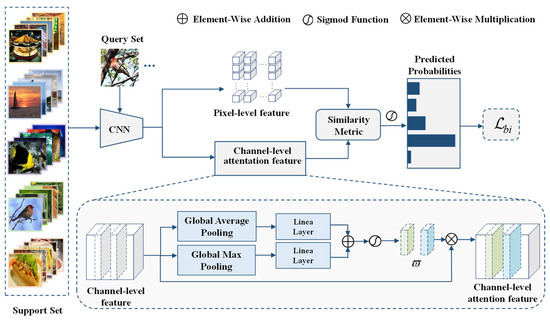 The framework of few-shot learning based on dSE attention. Features obtained by a backbone are expressed as pixel-level features and channel-level features, respectively. The channel-level features are fed into a double pooling squeeze and excitation (dSE) attention module to obtain the channel-level attention features, which, along with the pixel-level features, are input into a similarity metric to obtain the predicted class probability. is defined to improve the robustness of the model by making the best of the bi-directional selection relationship between queries and support classes.