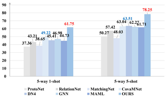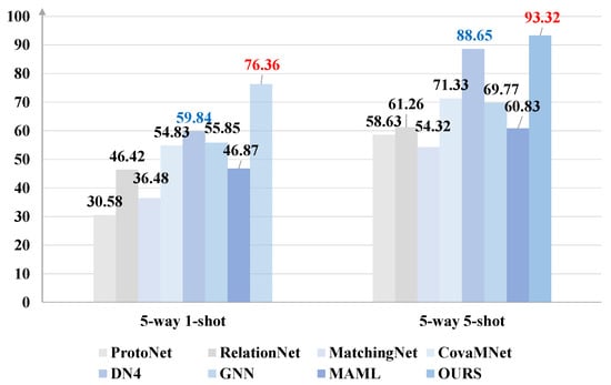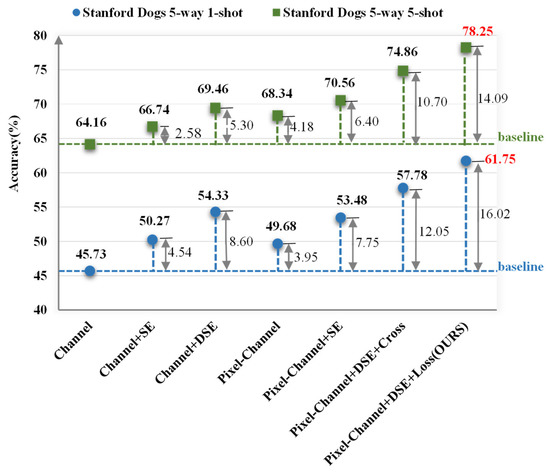 Figure 3, Figure 4 and Figure 5 summarize the results of our method on three fine-grained datasets under the 5-way–5-shot and 5-way–1-shot settings, respectively. Unlike the above-mentioned conventional datasets, Stanford Dogs, Stanford Cars, and CUB-200 are fine-grained datasets, which are even more challenging.
