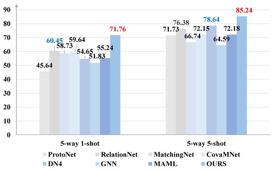 During the process of training, we employed the episode training mechanism to perform the end-to-end training. We set the training epochs to 50, and randomly sampled 100,000 episodes in each epoch. Moreover, we set the batch size to 4 with an initial learning rate of 5 × 10−3, reduced by half for every 10 epochs. The validation set was only used to track model generalization in all experiments. In the testing process, we evaluated our model of the average accuracy in the corresponding 95% confidence interval based on an average of 1000 tasks. To make a fair comparison with other methods, we employed the Conv-64F and ResNet-12 networks as our embedding network.