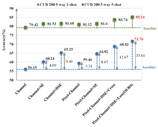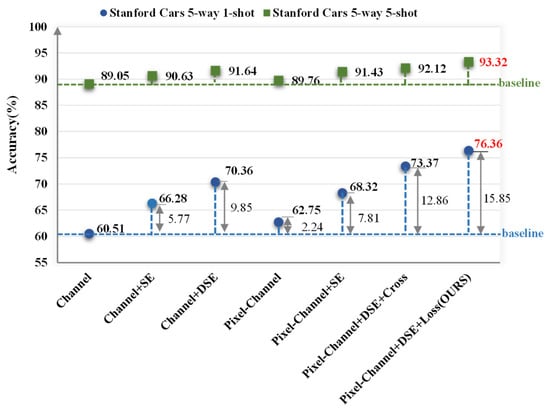 Compared with the baseline, the model with the “channel+dSE” set performed well, as shown in Figure 6, Figure 7 and Figure 8. For the Stanford Cars dataset, the performance had a significant improvement from the baseline by 9.85% (70.36% vs. 60.51%) when employing the dSE. The accuracy of the model using pixel-level and channel-level feature representations is higher than those of the methods only using channel-level feature representation. As shown in Figure 8, the method using channel-level feature representation improved by almost 4.18% (from 64.16% to 68.34%) on the 5-way–5-shot task. Comparing the results of the last two groups of experiments in Figure 6, Figure 7 and Figure 8, we found that the accuracy improved when employing our loss function instead of the cross-entropy loss in our mode for fine-grained few-shot image classification tasks.