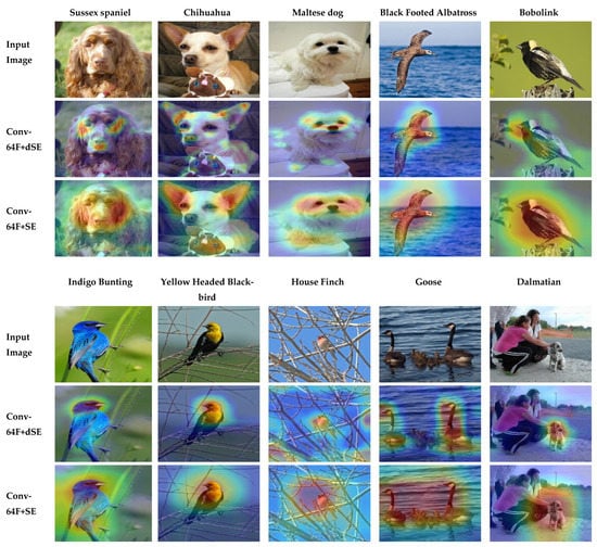 To show the benefits of attention mechanism dSE in our model, we compare the grad-cam activation maps of SE and dSE, respectively, in Figure 9. These experiments were conducted on Stanford Dogs, CUB-200, and miniImageNet with the Conv-64F backbone. As Figure 9 shows, the backbone with dSE can obtain more discriminative features of the object. For example, on the Stanford Dogs dataset, the model can clearly highlight the dog’s eyes, ears, and feet (if not obscured in the image) when using dSE, which are the parts of the dogs that are easy to distinguish. For miniImageNet, the last three columns show that the model employing dSE pays more attention to the foreground objects rather than the background with noise.