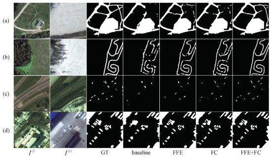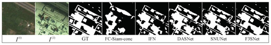 To more intuitively reflect the specific role played by these two modules, we visualized these four networks corresponding to Table 3. In Figure 9, there is a significant environmental variation (seasonal changes, illumination changes) between the bi-temporal images. We can observe that the baseline network cannot completely segment the change objects, especially the objects edges and slender objects. In addition to this, some small objects are missed.