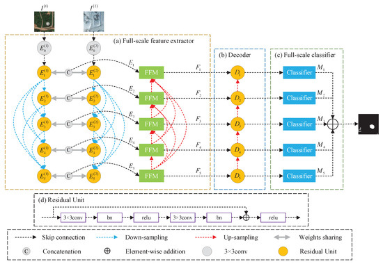 Many studies [19,22,37,38,39,40,41,42] of semantic segmentation have shown that feature maps of different scales explore distinctive information. The low-level feature maps capture rich spatial information and have finer-grained representations, which highlight object boundaries. In contrast, the high-level feature maps capture rich semantic information, which facilitates the identification of challenging samples. Based on this, multi-scale feature fusion can bridge the gap between feature maps of different scales. In recent years, some change detection methods [28,43,44,45] have improved network performance by fusing multi-scale feature maps, but they still do not explore enough information from full scales. We have summarized two ways for multi-scale feature fusion: (i) Low-level high-resolution feature maps are mapped to the high-level; (ii) High-level semantic feature maps are mapped to the low-level. Since the CD task between bi-temporal images is different from the semantic segmentation task of a single image, we re-design a novel full-scale feature extractor to encode full-scale features of bi-temporal images independently. As shown in Figure 2a, the spatial localization of deep features is enhanced by dense top-down skip connections, and dense bottom-up skip connections complement the changing semantics of shallow features. The full-scale feature extractor ensures that the extracted feature maps at all scales are semantically richer and spatially more precise.Compared with SNUNet, the full-scale feature extractor transfers the rich change semantic information from the deep layer to the shallow layer through dense bottom-up connections, which has at least three advantages: (i) facilitates the recognition of complex samples by shallow features; (ii) alleviates the semantic gap between encoder and decoder; (iii) combines deep supervision to induce the whole network to be trained more adequately.