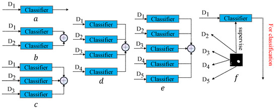 Comparison of different classifiers: (a–e) indicate that we combine the feature maps of different scales of the decoder for classification, where (a) is the typical classifier, (e) is our full-scale classifier, and (b–d) are in between. (f) indicates that the full-scale classifier is replaced by full-scale deep supervision and uses only for classification.