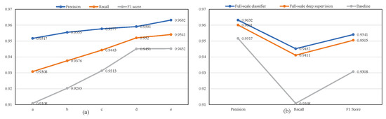 According to Figure 4b, full-scale deep supervision significantly improves the network performance, which indicates that one of the roles of the full-scale classifier is deep supervision. On the other hand, compared to full-scale deep supervision, the full-scale classifier improves the precision, recall, and F1-score of the network by 0.31%, 0.41%, and 0.36%, respectively, and these improvements can be attributed to the fusion of the full-scale prediction maps. Overall, the primary role of the full-scale classifier is to train the feature maps in the intermediate layer more fully, and the secondary role is to fuse the full-scale prediction maps.