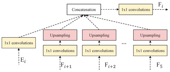 To achieve information interaction, feature maps of the same scale for the two streams in the top-down branch are concatenated. denotes the set of the concatenated feature maps, i is layer indexes, then can be represented as:
