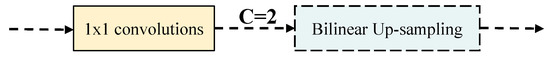 To further exploit these feature maps, we propose a full-scale classifier that combines feature maps from all scales of the decoder for classification with marginal extra cost. Specifically, the full-scale classifier consists of five lightweight classifiers that correspond to five feature maps of different scales of the decoder. For simplicity, each classifier consists of a 1 × 1 convolutional layer followed by a bilinear up-sampling ( is not upsampled). As shown in Figure 6, the feature map is first reduced to 2 channels (change or unchanged) by the convolution, then upsampled to the same scale as the original images. Finally, the prediction maps generated by these five classifiers are merged by element-wise addition. Then, the full-scale classifier can be calculated as follows: