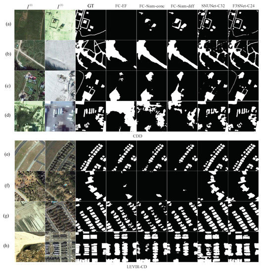 - FC-Siam-diff [25]: Deep features of the raw images are extracted by a siamese network, and the feature differences are fed into the decoder.