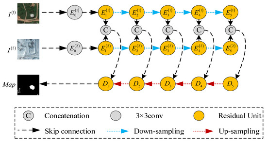 where denotes the bi-temporal images, function denotes a convolution layer followed by a batch normalization and a ReLU function. denotes the residual unit, as shown in Figure 2d, indicates down-sampling (max pooling), and represents the concatenation.