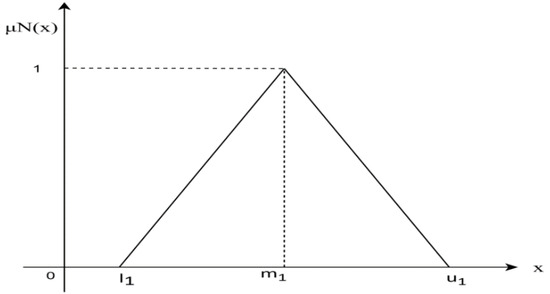 Several researchers have used different types of membership functions in their corresponding work, like trapezoidal fuzzy numbers, Gaussian numbers, triangular fuzzy numbers, etc. In this paper, the authors consider the TFN numbers that lie between 0 and 1 [39]. It is easy to adapt, and compute with the TFN functions and affords the straightforwardness associated with the fuzziness dataset [40]. Moreover, a fuzzy digit N on F is known as TFN; its general membership function is represented by Equation (1).