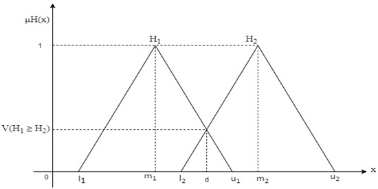 The degree of possibility (DP) has to be calculated in this phase because there may be an existing TFN value between the two fuzzy numbers. Consider, there exist two triangular fuzzy numbers say H1 = (l1,m1,u1) and H2 = (l2,m2, u2), then their DP must be H1 ≥ H2 is given by