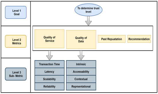 - Quality of Services: The QoS metric is utilised to determine the performance of a social IoT node by successfully responding to an end-user request by following certain criteria of a service level agreement [26]. The QoS metrics include sub-metrics such as latency, transaction time scalability, and reliability. Transaction time is defined as the sum of request time and response-receiving time. Latency is the amount of time it takes the SIoT server to finish a client’s request, which can be affected by different propagation delays. Scalability is responsible for a scalable system for reinforcement of QoS to produce maximum throughput under heavy workload in a SIoT-based environment. Reliability is the chance that an SP will give its client the services they want according to a set of rules for a certain amount of time without failing.