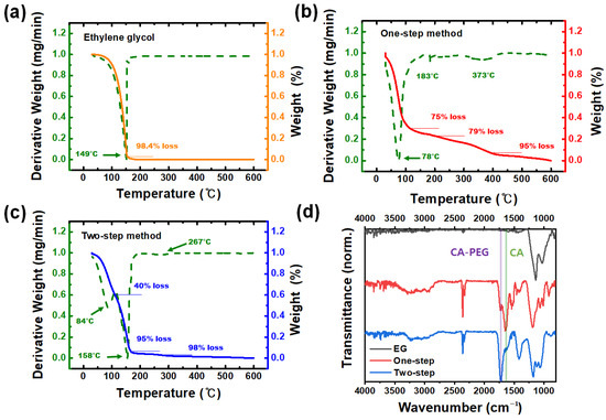 Figure 2a–c show the TGA curves of the EG, the one-step-coated film, and the two-step-coated film. The weight loss at ~80 °C is attributed to the elimination of the remaining or absorbed water molecules. Secondly, the weight loss at around 150 °C corresponds to the decomposition of EG and sulfate ions, which is followed by the continuous decomposition of citric acid complexes. The elevated EG decomposition temperature in the mixture film implies that the polyesterification takes place for both cases.