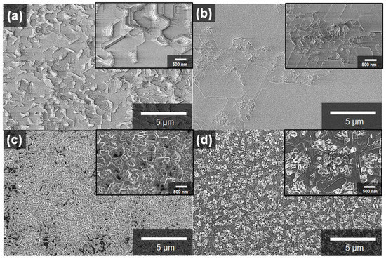 Scanning electron microscope images of the surfaces for the beryllium oxide layers created by the two-step spin-coating method depending on the content ratio: (a) 0.5:1, (b) 1:1, (c) 2:1, and (d) 3:1 citric acid and beryllium sulfate.