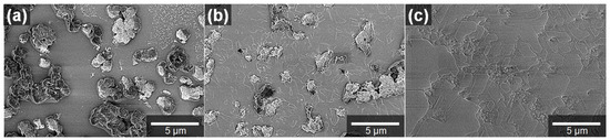 Figure 4a–c show SEM images of the change in the morphology of the BeO with a CA/BeSO4 ratio of 1:1 depending on sintering temperatures of 1100 °C, 1300 °C, and 1500 °C. According to the structural change in the surface, the serial process of the formation of the thin film can be indirectly inferred. Although thin film growth in our case begins with a precursor film and becomes a thin film, the route of the thin film formation process of “nucleation-nuclei growth-coalescence-continuous film” can be correspondingly observed [24,25,26]. After nucleation and nuclei growth (the initial stage of the Pechini method), the island microstructure aggregates into sub-micron particles of BeO, which were observed to gather in an irregular structure according to the image taken at 1100 °C at a higher resolution. At the sintering temperature of 1300 °C, the island microstructures are more condensed and ordered compared with those at 1100 °C. The hexagonal-like grains of the BeO layer were locally grown and covered the surface of the space between the island microstructures (Figure S3) caused by the effect of the increased lateral atomic diffusion due to the higher sintering temperature. When the sintering temperature reaches 1500 °C, the island layer is filled, and a continuous BeO thin film is completed. Additionally, the grain size is significantly larger, and smaller grains exist between the larger grains. A cross-sectional SEM image of the BeO layer is shown in Figure S3, but the thickness of the BeO layer is not distinguishable in this case because the conductivity of both the BeO layer and the sapphire substrate were insufficient.