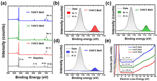 Figure 6a shows the XPS data of the BeO thin film specimens according to the sintering temperature, as used to analyze the elemental/chemical state change of BeO thin films. The wide survey scan shows the Al 2p, C 1 s, and O 1 s peaks at binding energies of 73.62 eV, 284.62 eV, and 530.62 eV, respectively [29,30,31]. The Be 1 s and Al 2 s peaks were convoluted due to the overlapping of the Be 1 s and Al 2 s orbital energy levels; these are separately plotted as the high-resolution spectra in each case depending on the sintering temperature and are fitted as shown in Figure 5. The complete Be oxidation by the sintering process enhanced the portion of the Be-O-dominant spectra at 113.5 eV, while the chemical states of the Be-Be bonds when the binding energy was 110.7 eV were absent [29]. Furthermore, the Al-O peak at 119.0 eV represents the photoelectrons of Al 2 s in the sapphire substrate due to the penetration of X-rays into the BeO thin films [30,32]. Figure 6e shows the REELS fitting of the optical bandgap of BeO thin films with different sintering temperatures. The optical bandgaps of BeO layers after sintering at 1100 °C, 1300 °C, and 1500 °C were 8.05 eV, 8.1 eV, and 8.1 eV, respectively. Earlier related studies reported similar values of 8.0 eV, 8.57 eV (theoretically), and 10.7 eV (experimentally) [33,34,35]. Unfortunately, the bandgap differences in BeO layers after sintering at 1100 °C, 1300 °C, and 1500 °C were insufficient due to the X-ray penetration onto the BeO layer, but the bandgap values of the BeO layers at higher sintering temperatures were slightly larger than those at a lower sintering temperature.