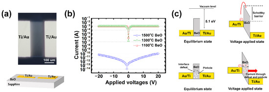 The OM image of the MIM device under the 1500 °C sintering condition and the I-V characteristics of the MIM device with BeO thin films created with different sintering temperatures are correspondingly shown in Figure 7a,b. In the OM image, the patterned active channel distances between the lateral electrodes are 150 μm, and the width is 385 μm. Although the active channel was patterned with a shadow mask for the lateral structure of the MIM device, an additional process such as wet etching is also possible if the proper etchants are used [36]. Contrary to the smooth surface of the active region, numerous defects and pinholes can be observed in the OM images of the active region of the MIM device with BeO layers after sintering at 1100 °C and 1300 °C (Supplementary Figure S4). The pinholes and defects formed on the surface or inside of the Insulating layer are directly related to the significant deterioration of the insulating capabilities of the insulating layer [37,38,39].