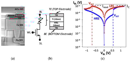 An OxRAM memory cell consists of two metallic electrodes that sandwich a thin dielectric layer serving as a permanent storage medium. This Metal-Insulator-Metal (MIM) structure, denoted as RRAM in Figure 1a, can be easily integrated in the BEOL on top of the CMOS subsystem. The MIM structure is integrated on top of the Metal 4 copper layer (Cu). A TiN Bottom Electrode (BE) is first deposited. Then, a 10 nm-HfO2/10 nm-Ti/TiN stack is added to form a capacitor-like structure [16]. Figure 1b shows the basic 1T-1R memory cell schematic where one nMOS transistor (W = 0.8 µm and L = 0.5 µm) is connected in series with an OxRAM cell. Figure 1c presents a typical 1T-1R OxRAM I-V characteristic in logarithmic scale. Based on the I–V curve, the memory cell operation can be seen as follows: after an initial electro-FORMING (FMG) step [17], the memory element can be reversibly switched between the Low Resistance State (LRS) and the High Resistance State (HRS). Resistive switching corresponds to an abrupt change between the HRS and the LRS. The resistance change is triggered by applying specific biases across the 1T-1R cell (Table 1), i.e., VSET to switch to LRS and VRST to switch to HRS. In the 1T-1R configuration, the transistor controls the amount of current flowing through the cell according to its gate voltage bias. The maximum current allowed by the select transistor is called the compliance current and is referred to as IC in Figure 1c. The compliance current IC controls the LRS resistance value in the SET state as well as the maximal RST current Ireset.