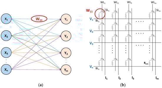 (a) Two-layer feed-forward neural network; (b) matrix–vector multiplication in a 1T-1R OxRAM array.