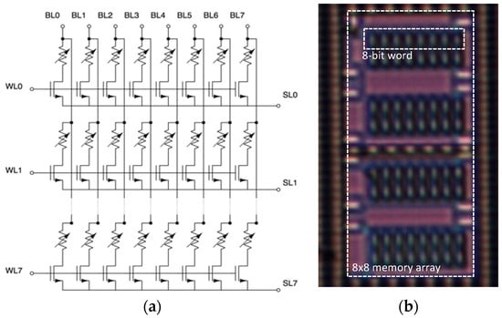 (a) 8 × 8 OxRAM memory array and (b) corresponding micrograph of the memory array test chip fabricated in a 130 nm CMOS technology.