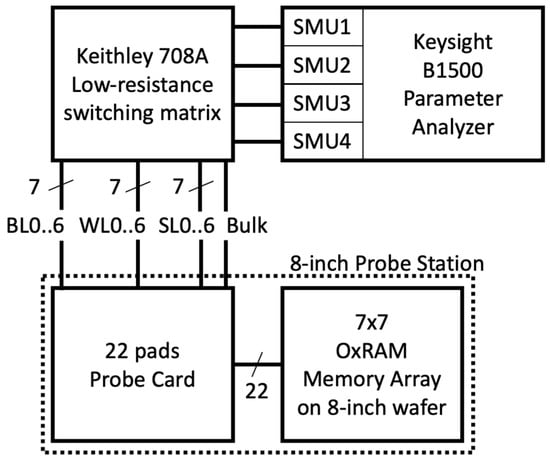 Figure 4 describes the experimental setup, which is based on a Keysight B1500 semiconductor parameter analyzer. The studied structure is embedded on an 8-inch wafer, connected to the B1500 through a probe card and a low-resistance switching matrix Keithley 708A. The matrix connects the Source/Measure Units (SMUs) to the memory array pads during the FMG, SET, RST, and READ operations. All the experiments are conducted through Python programs, controlling the equipment.