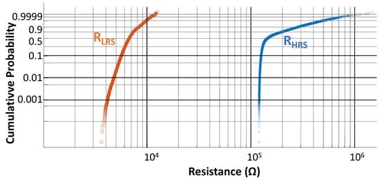 Although OxRAM-based devices have shown encouraging properties, challenges remain, among which device variability (or reproducibility) is the main [22]. In fact, variations of RHRS. and RLRS can be so unpredictable that they have been employed as an entropy source in True Random Number Generators (TRNG) [23,24]. Indeed, the variance from cycle to cycle (C2C) and from device to device (D2D) can be very large, directly impacting the memory cell HRS and LRS resistances. This inherent drawback of the technology has to be investigated to assess the multiple resistance levels capability of the considered OxRAM technology. To highlight the impact of variability on HRS and LRS resistances, a set of preliminary measurements are conducted. Before any SET/RST operations, the memory array is first formed. Then, memory cells are RST one by one to extract their HRS resistance. After RST, cells are SET to extract their LRS resistance. Figure 5 shows the cumulative probability plots obtained after 500 consecutive RST/SET cycles applied to the memory array (500 × 49 cells). As the same memory array is programed 500 times, both D2D and C2C variabilities are captured. A 0.1 V READ bias voltage is used to extract RLRS and RHRS distributions. Figure 5 shows that variability has a huge impact on HRS and LRS resistances. The HRS distribution spread is more pronounced compared to the LRS spread, which is a common feature of OxRAM technologies [25]. These experimental results clearly indicate that the variability of the OxRAM technology needs to be accounted to implement multilevel cell operations.